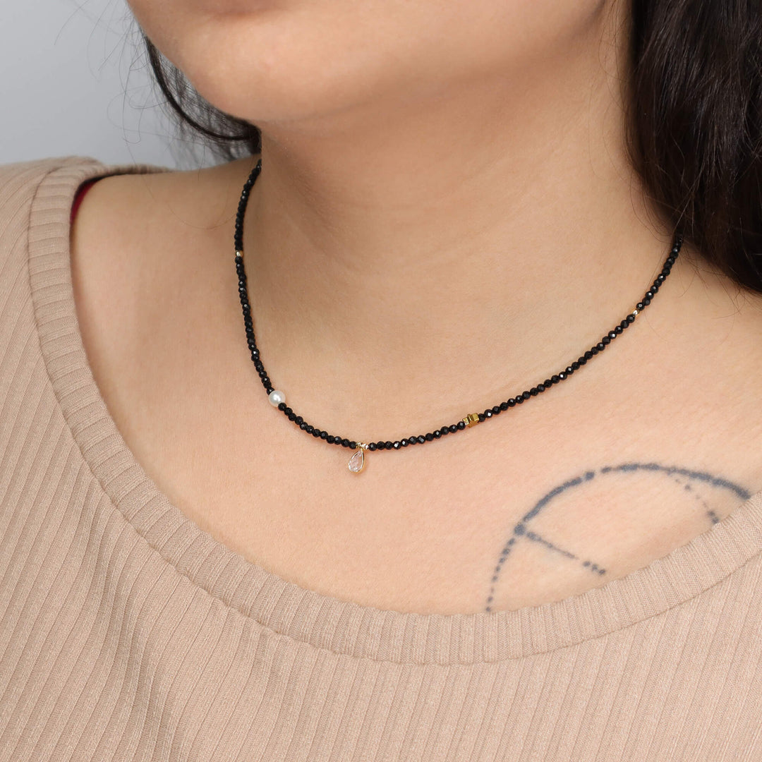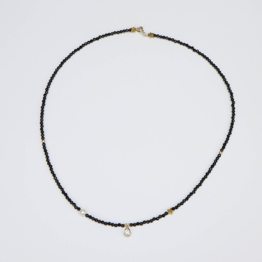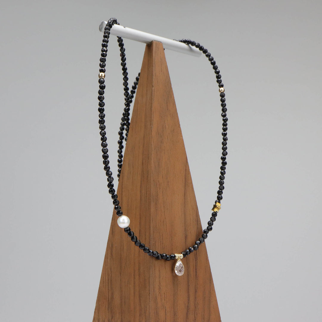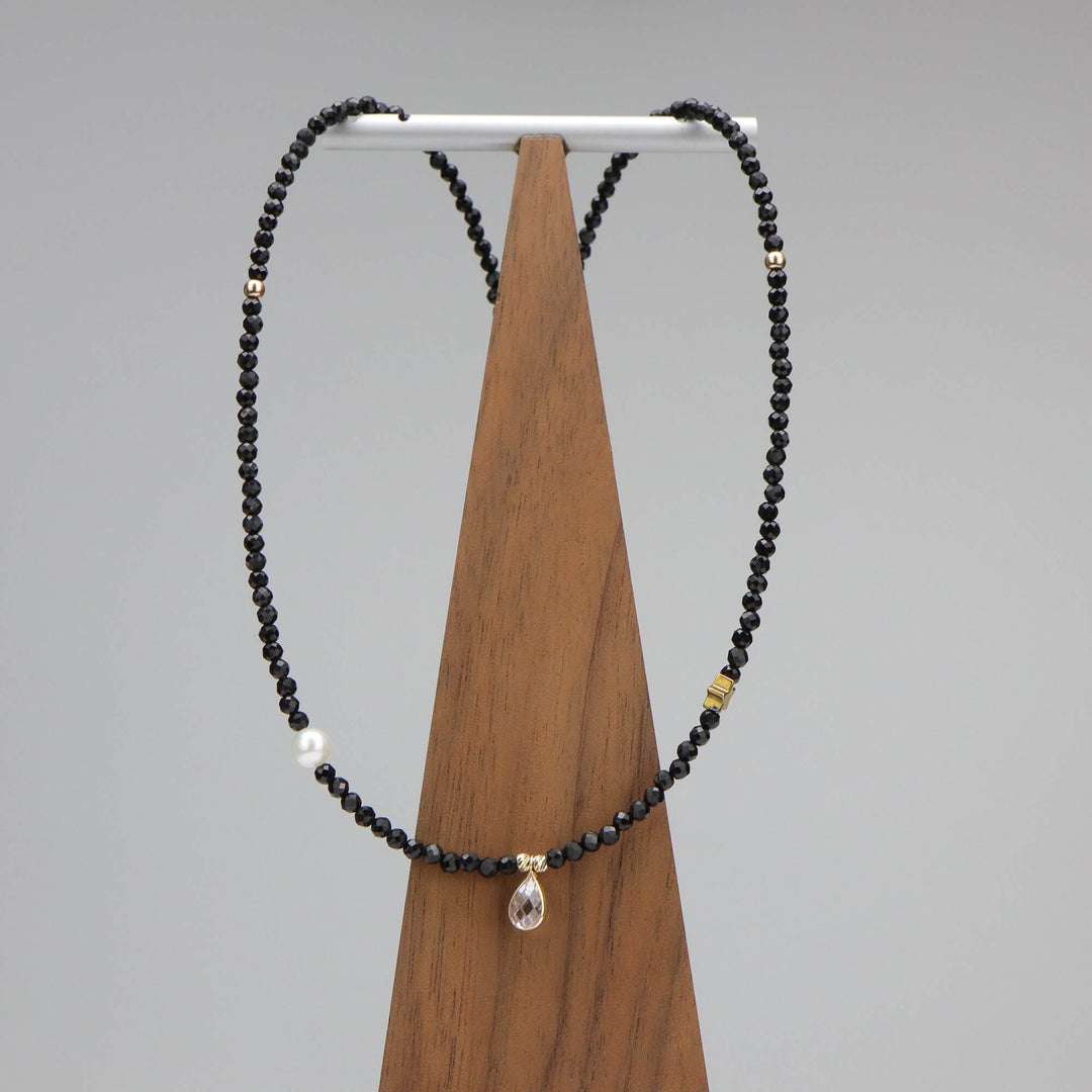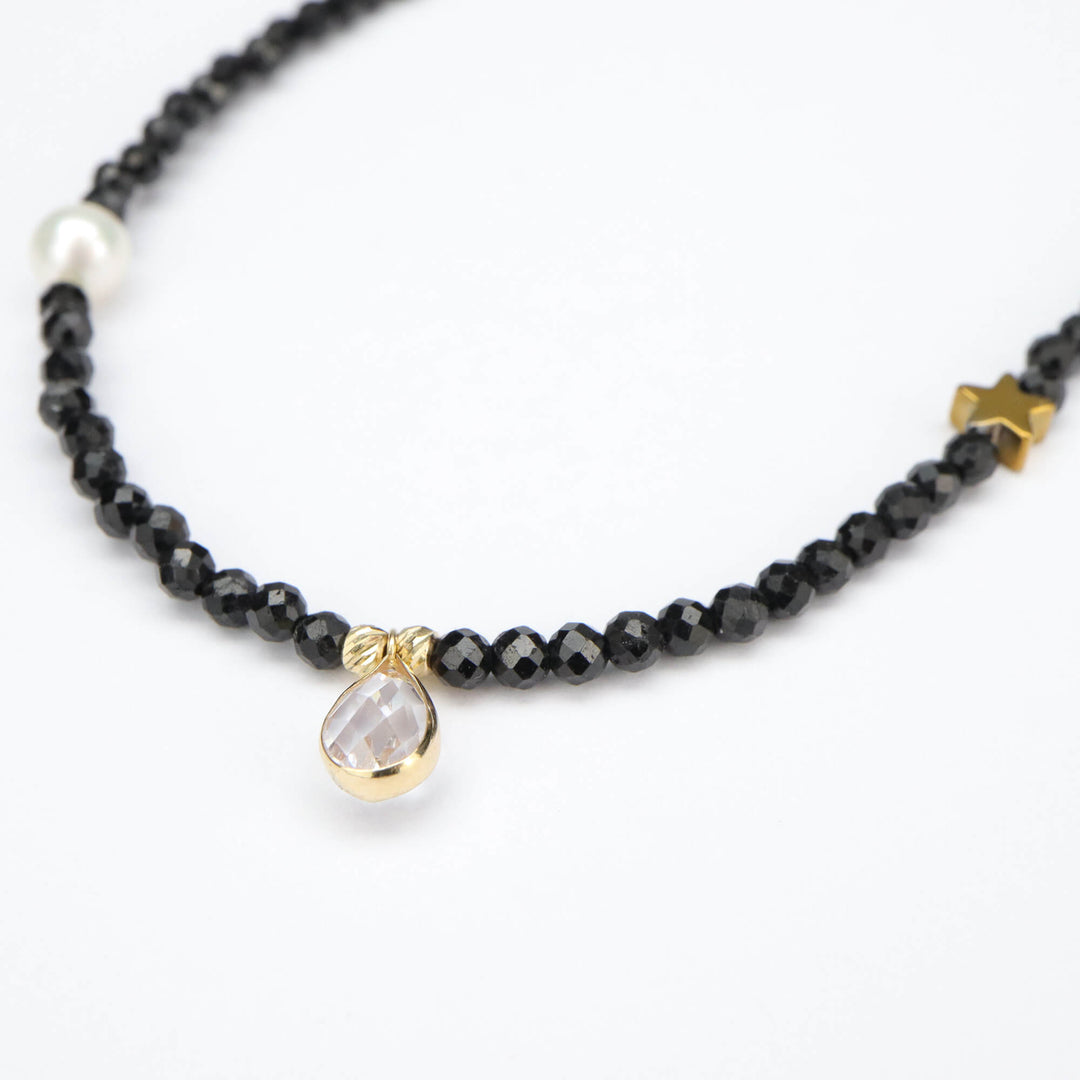 Colier cu mix de pietre naturale- turmalină neagră, hematit și perlă, cu elemente din aur galben de 14k și pandantiv delicat cu zirconie strălucitoare.