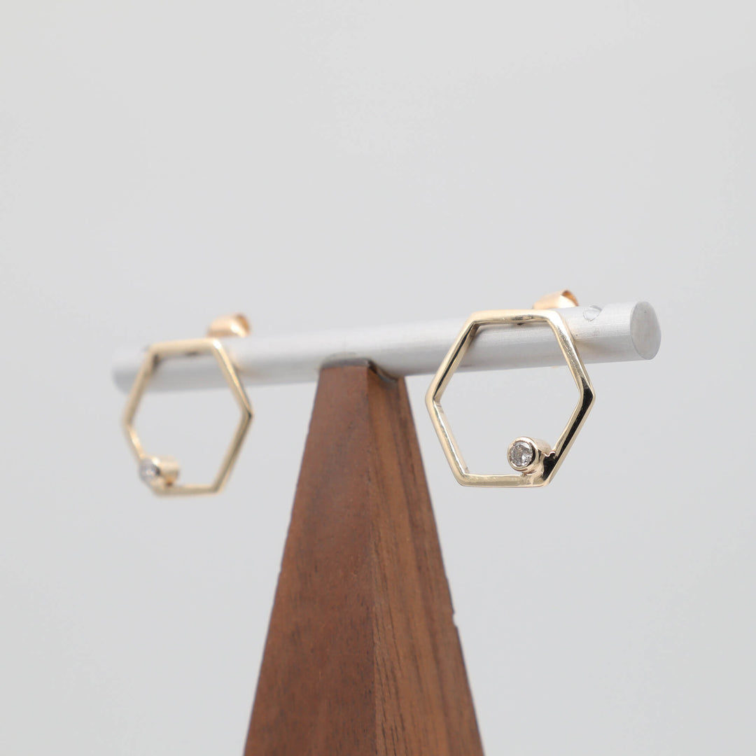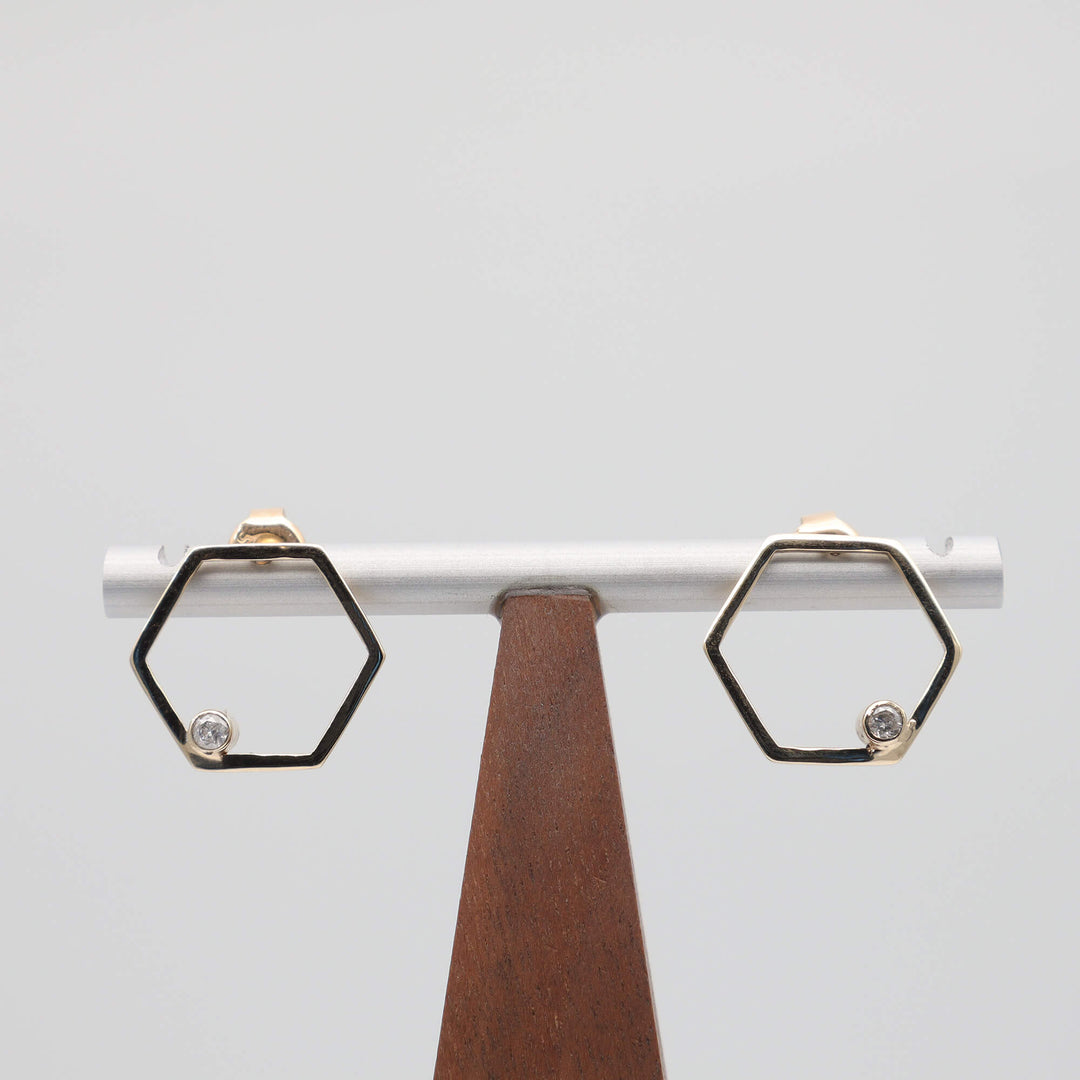 Încântă-ți simțurile cu cerceii hexagonali din aur de 14k, încrustați cu diamante strălucitoare. O combinație perfectă între eleganță și modernitate pentru o apariție sofisticată și distinsă.
