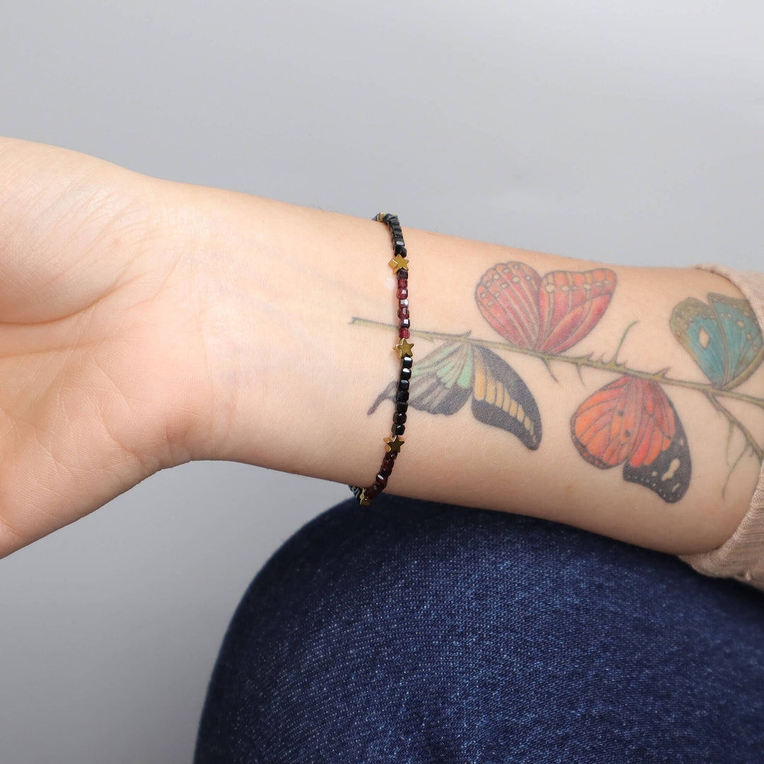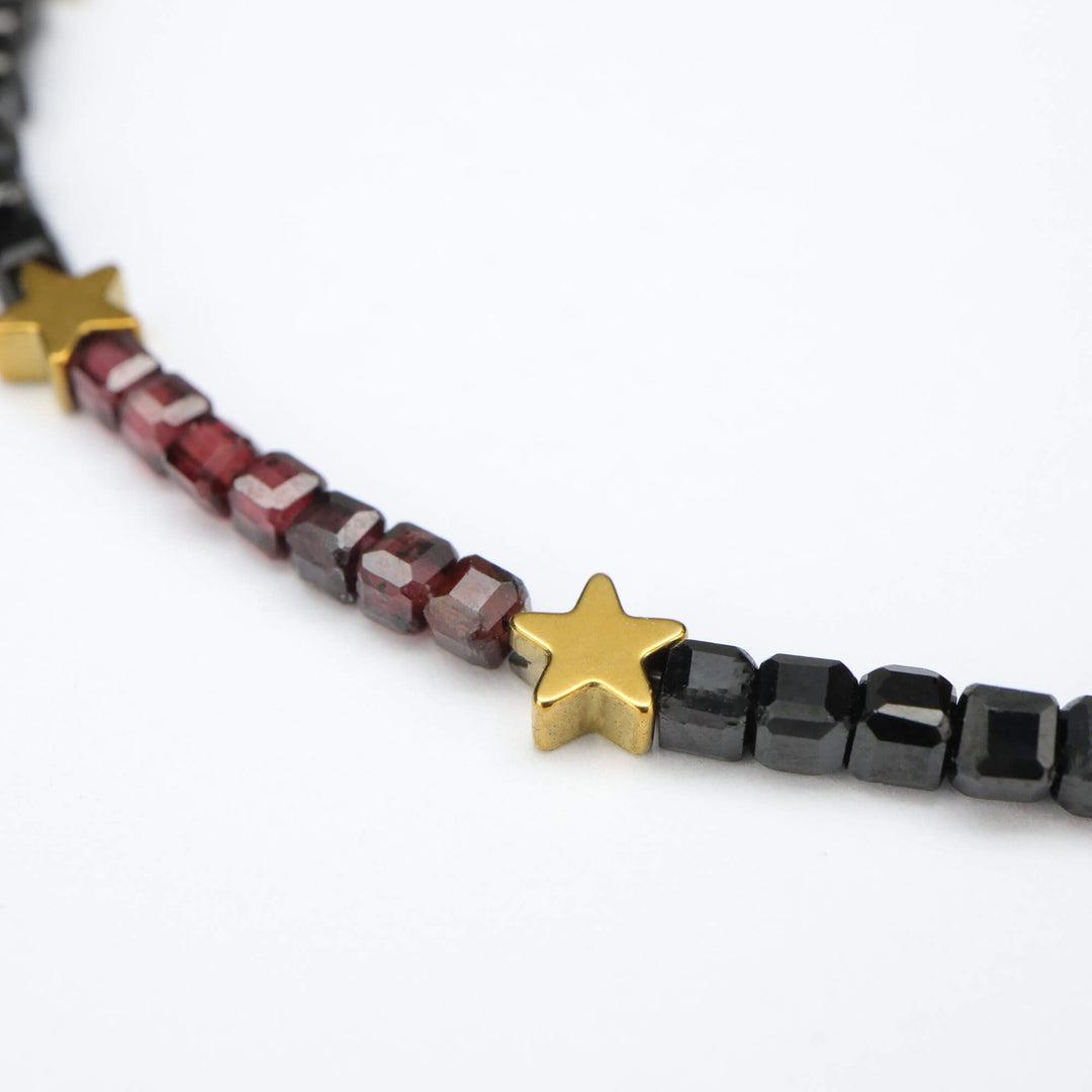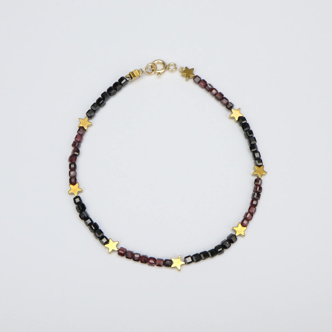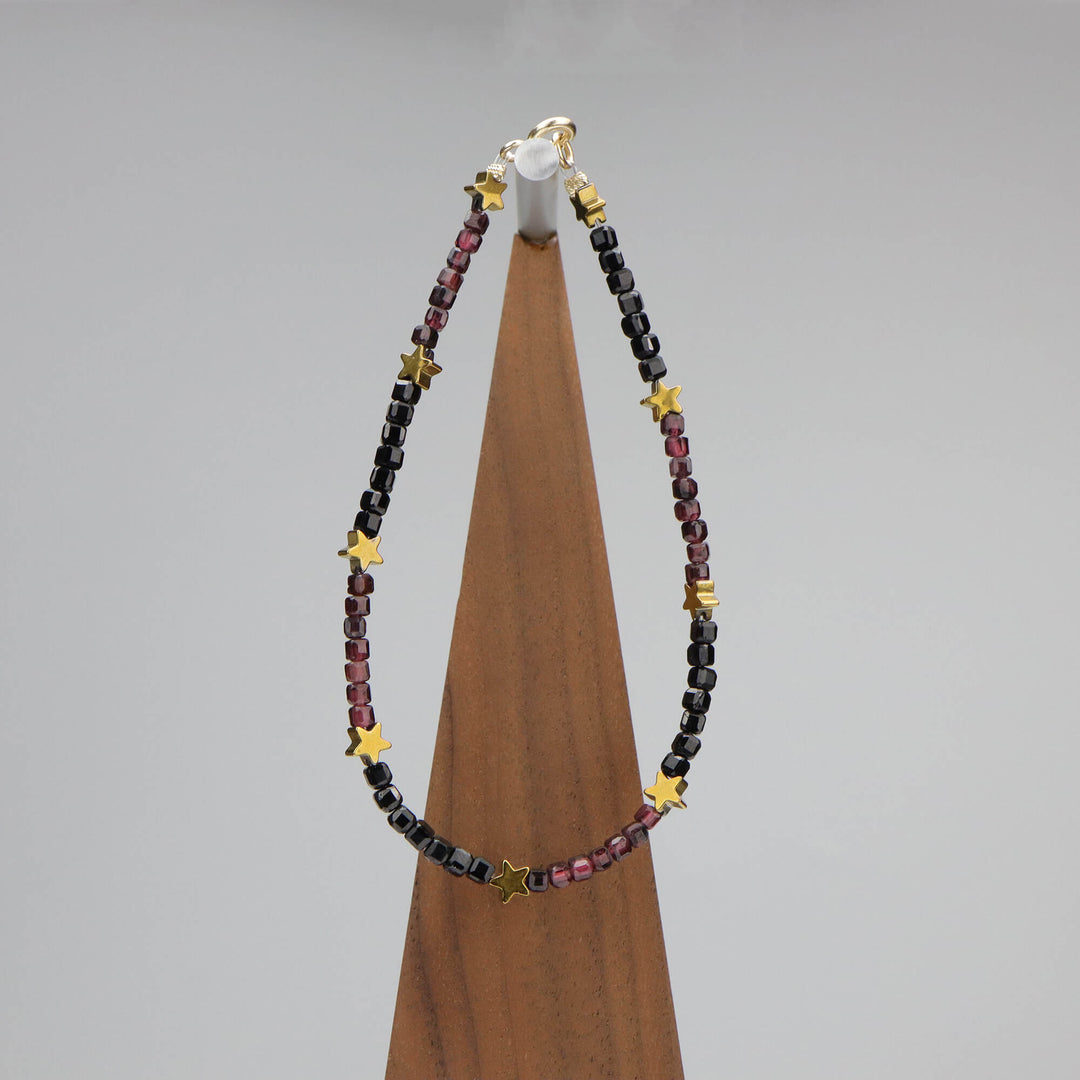 Brățară cu mix de pietre naturale- spinel negru, hematit și granat, cu elemente din aur galben de 14k.